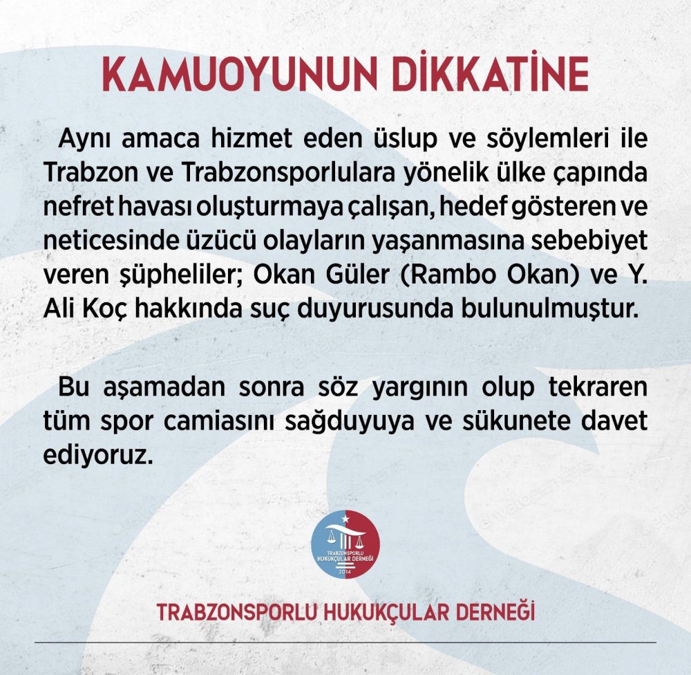 Trabzonsporlu Hukukçular Derneği Fenerbahçe Kulüp Başkanı Ali Koç'un Trabzonspor'a ve Trabzonlulara yönelik ötekileştirici söylemleri hakkında suç duyurusunda bulundu. Trabzonsporlu Hukukçular Derneği resmi sosyalmedya hesabında şu açıklamaları yaptı: "Trabzon ve Trabzonsporlulara yönelik ülke çapında nefret havası oluşturmaya çalışan, hedef gösteren ve neticesinde üzücü olayların yaşanmasına sebebiyet veren; Okan Güler (Rambo) ve Y. Ali Koç hakkında suç duyurusunda bulunulmuştur."