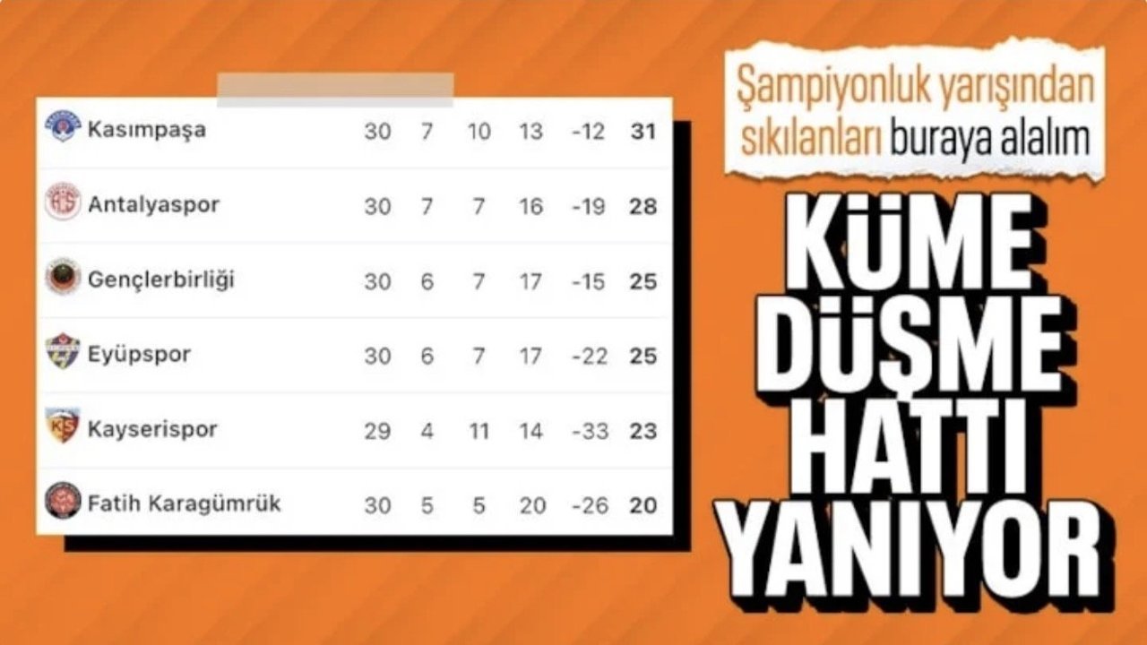 13. sıradaki Kasımpaşa'nın 31 puanı bulunurken 12. sırada yer alan Alanyapsor'un ise 33 puanı bulunuyor.