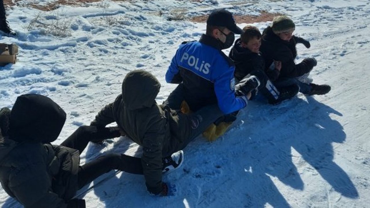 Uşak’ta geçtiğimiz günlerde başlayan kar yağışı yer yer 10 santimetre kalınlığa ulaşmıştı. Meydana gelebilecek olumsuzlukları önlemek için Elmalıdere Mahallesi’nde devriye atan Toplum Destekli Polislik Şube Müdürlüğü ekipleri, poşetle yardımıyla karda kayan çocukları fark etti.