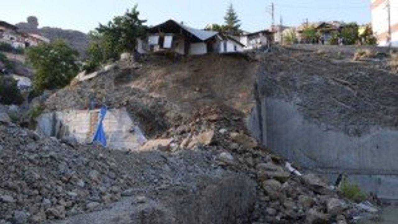 Gümüşhane’de apartman yapmak için boşaltılan alanda göçük meydana geldi. İstinat duvarının bir kısmı ve kimsenin yaşamadığı evin bir kısmı inşaat alanına yıkıldı.