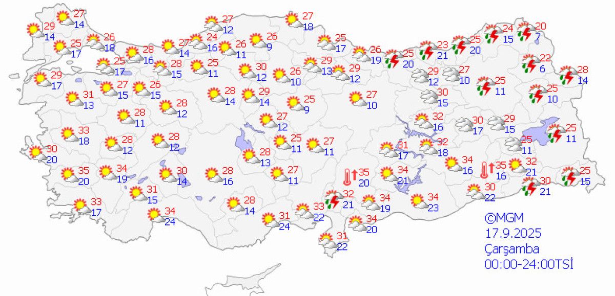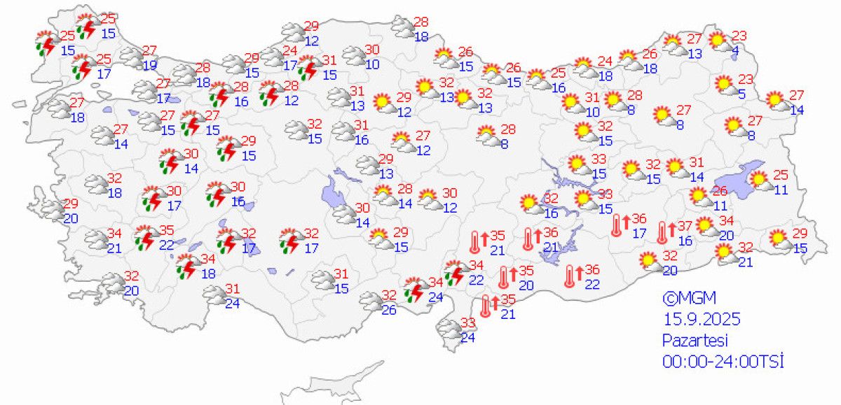 Salı Trakya ve doğu Marmara'da (Kırklareli kıyıları) sağanaklar devam ederken, hava parçalı az bulutlu; Ege ve Akdeniz'de 25-32 derece, Doğu Anadolu'da 18-26 derece gibi serin değerler öngörülüyor.