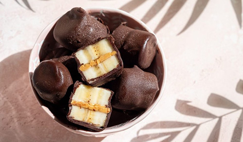 Muzları yuvarlak olarak dilimleyin. Yağlı kağıt üzerine bir sıra muz dilimlerini dizin. Üzerlerine fıstık ezmesi (veya badem ezmesi) sürün ve tüm dilimlerin üzerine birer dilim daha ekleyerek kapatın. Buzluğa koyun, en az 1 saat bekleyin. 5 yemek kaşığı Hindistan cevizi yağı ile 1 fincan çikolata parçalarını (beyaz, bitter veya sütlü, hangisini tercih ederseniz) küçük bir tencerede ısıtın, karıştırarak pürüzsüz bir çikolata sosu oluşturun. Buzluktan çıkardığınız muzları, oda sıcaklığındaki çikolatanın içine daldırın ve yağlı kağıtların üzerine dizin. En az 1 saat buzlukta dondurun. Muzlarınız hava almayacak şekilde poşetlerseniz buzlukta 3 aya kadar dayanabilir.