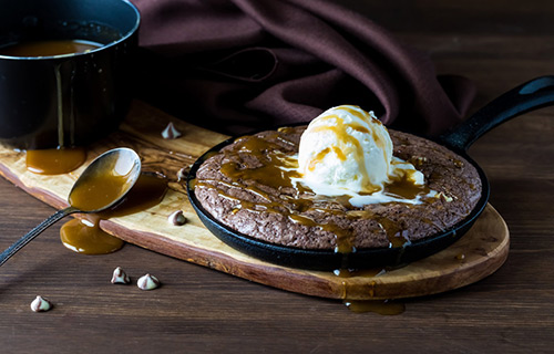 Fırını 175 derecede ısıtın. Çeyrek su bardağı eritilmiş tereyağı, yarım su bardağı toz şeker, 2 yemek kaşığı kakao, çeyrek çay kaşığı tarçın, 1 tatlı kaşığı vanilin, bir tutam tuzu orta boy bir kapta iyice çırpın. 2 büyük yumurtayı ekleyip ipeksi bir karışım elde edene kadar çırpmaya devam edin. Yarım su bardağı unu ve yarım fincan çikolata parçasını karışıma ilave ederek kek hamuru kıvamına gelene kadar karıştırın. Yüksek bir fırın tavasına dökün ve 22-25 dakika kadar, ortası hafifçe şişene kadar pişirin. Fırından çıkarıp üzerine dondurma koyun ve sıcak servis yapın.