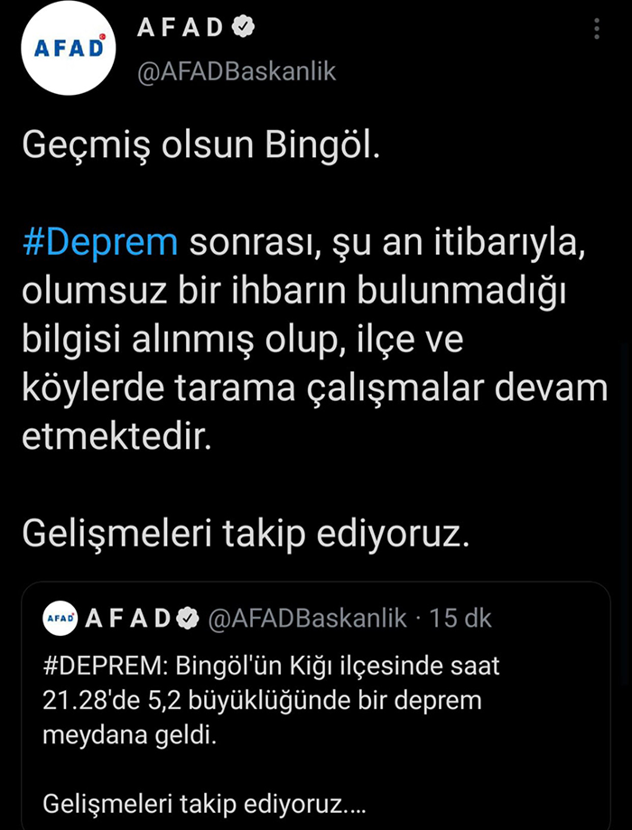 İçişleri Bakan Yardımcısı İsmail Çataklı: "Bingöl - Kiğı’da saat 21.28’de 5.2 büyüklüğünde bir deprem meydana gelmiştir. An itibariyle Bingöl, Erzurum, Erzincan, Elazığ ve Diyarbakır’dan olumsuz bir ihbar ulaşmamıştır. Ekiplerin mahallinde tarama çalışması devam ediyor. Ayrıntılı bilgi ayrıca verilecektir."